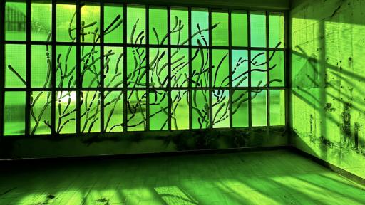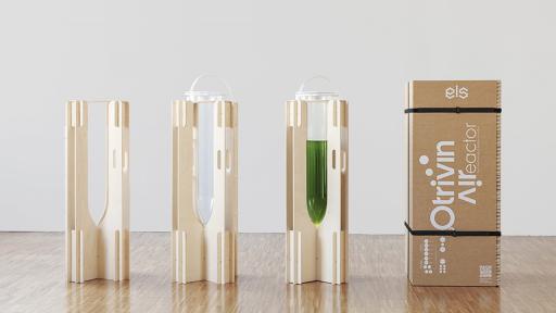 This indoor photo bioreactor absorbs carbon dioxide and pollutants using algae.